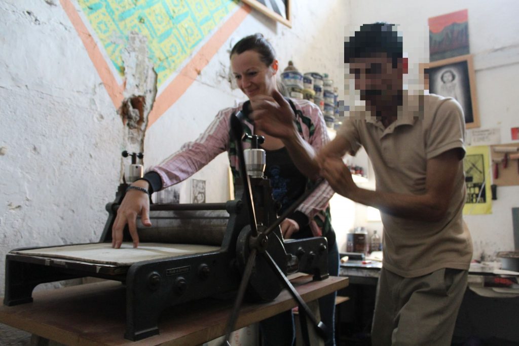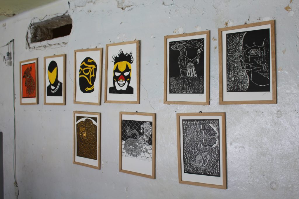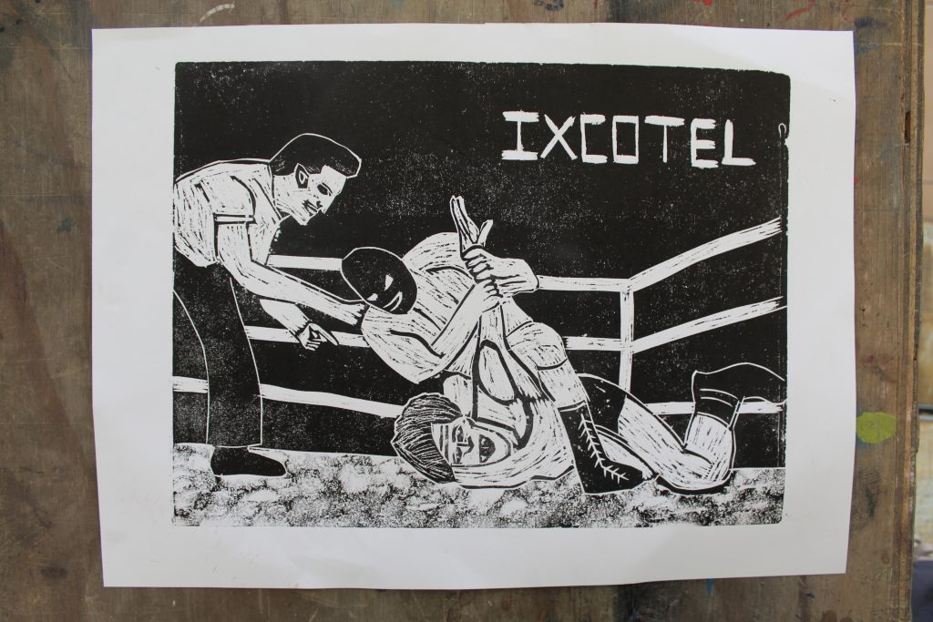 Nous avons commencé par investir un atelier de gravure le lundi dans un petit endroit de la prison d’Ixcotel, avec les matériaux élémentaires pour la gravure. On imprimait à la main et on avait comme premier projet la création de la « loterie Canera ».