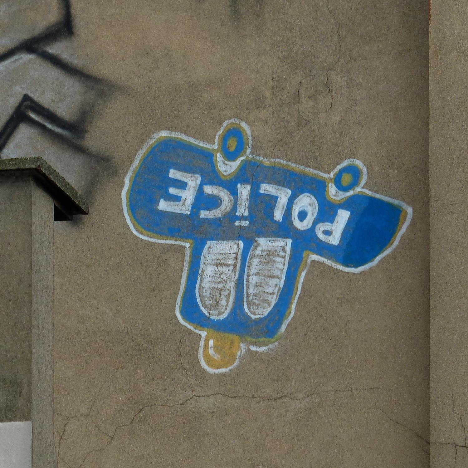 Un nœud avec une chaise de calfat, un baudrier système D, il plonge le long des parois lisses pour marquer l’espace, y laisser sa trace. Ecilop, qui ne se réclame d’aucune école, a inventé une nouvelle discipline dans le milieu clos des graffeurs vandales, le graff au bout d’une corde. « L’homme préhistorique du rappel. » Il trace sur des surfaces vides, inaccessibles sa voiture de police les roues en l’air dans un style naïf et épuré dont il a tiré son nom : Police/Ecilop. L’anagramme est puissante. Il y a du sacré dans son acte.