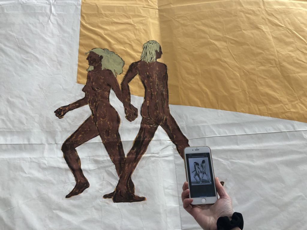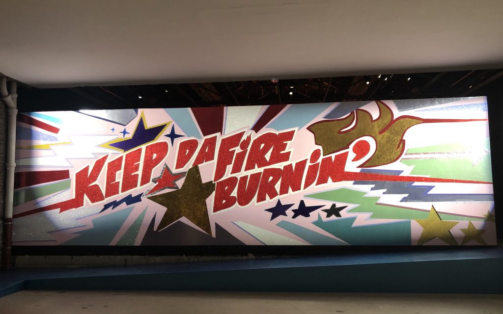L’oeuvre la plus frappante trône au centre. Tout le monde se photographie devant cette immense fresque faite comme une pochette d’album, réalisée avec les codes esthétiques du grafitti et avec des tissus cheap de la place Saint pierre à Montmartre.