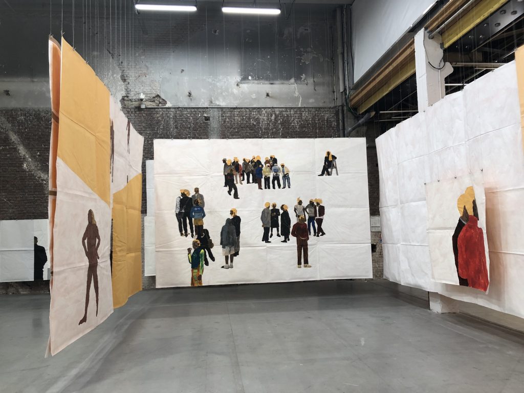 Ses grands panneaux-tableaux cloisonnent les espaces, nous enferment dans des cubes blancs et jouent de la perspective. Toutes les personnes peintes sont noires, cheveux décolorés en blond pour recréer une unité, une communauté.