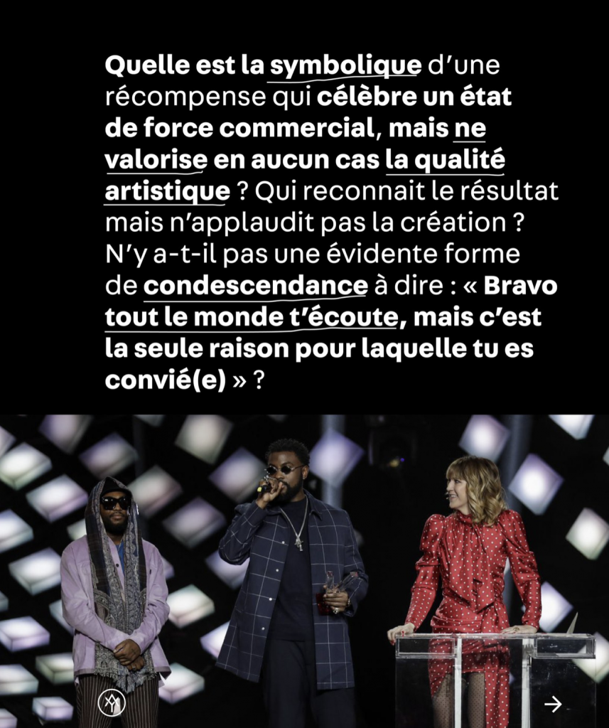 Autrement dit, pour le dire vrai et sans fioriture, c’est très très blanc tout ça. Les victoires de la musique seraient elles en réalité les victoires de la blanchité? La question se pose.