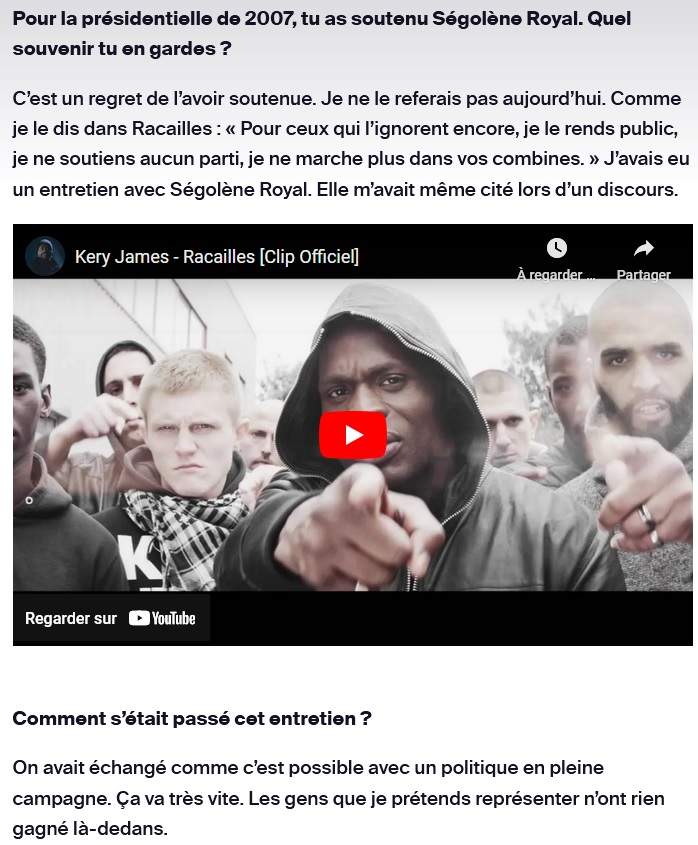 Il existe tout un triste historique du rap français inféodé à la gauche institutionnelle, autrement dit le Parti Socialiste. Pour les plus jeunes qui ignorent de quoi il s’agit, rappelez-vous la réplique de Weasel à Deadpool avant que le héros vêtu de rouge parte affronter les méchants : « je pourrais t’aider, mais j’en ai pas envie ». C’est une synthèse assez fidèle de leur ligne politique. Quand le rap hexagonal explose, ces braves gens se disent que c’est un bon moyen de récupérer des voix de banlieue à condition que leur discours n’aille pas trop loin. Cela a souvent lieu via les paillassons de SOS Racisme qui ont toujours eu leurs entrées à Skyrock.